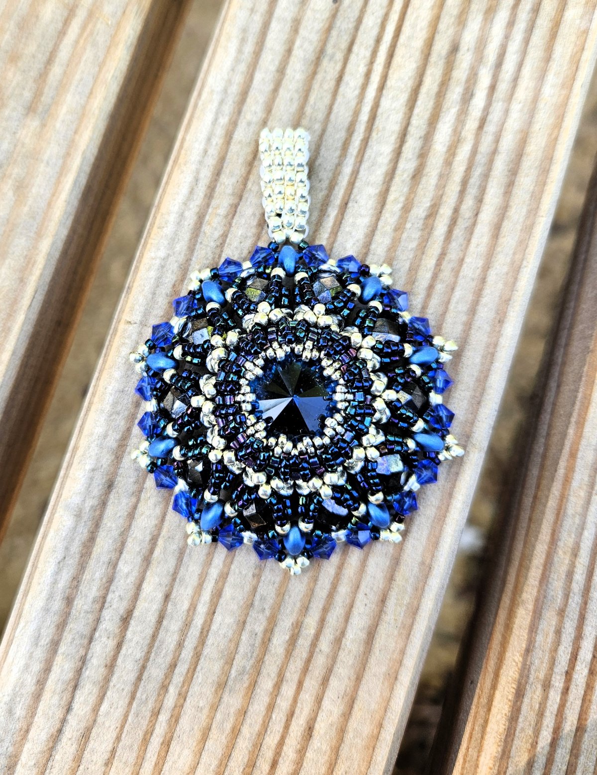 Quadrina un pendentif très élaboré avec des chatons en cristal, sertie avec des rocailles sur une base de perles de bohème